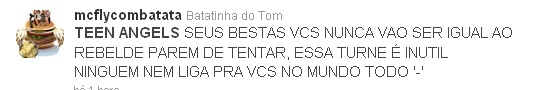 É ISSO MESMO, CONCORDO COM O DAVYD, AMO REBELDE BRASIL E A BANDA REBELDES, MAS AMO AINDA MAIS TEEN ANGELS, DEVENDO COM UNHAS E DENTES, POIS MERECEM TUDO DE BOM, E NÃO É JUSTO ALGUEM FICAR FALANDO MAL DELES, EU POR EXEMPLO NÃO GOSTO DO REBELDE MEXICANO E NAO É POR ISSO QUE FICO FALANDO EM TWITTER,FACEBOOK E ETC, RESPEITO QUEM GOSTA DE RBD, E NOS FAS DE TEEN ANGELS TBM QUEREMOS O DEVIDO RESPEITO, E PRA INFORMAÇÃO DESSE SUJEITO QUE FICA FALANDO MAL DOS TEENS, A TURNE DELES ESTÁ SENDO UM SUCESSO ABSOLUTO, ELES TEM MTS FAS EM TODOS OS CANTOS DO MUNDOOOO